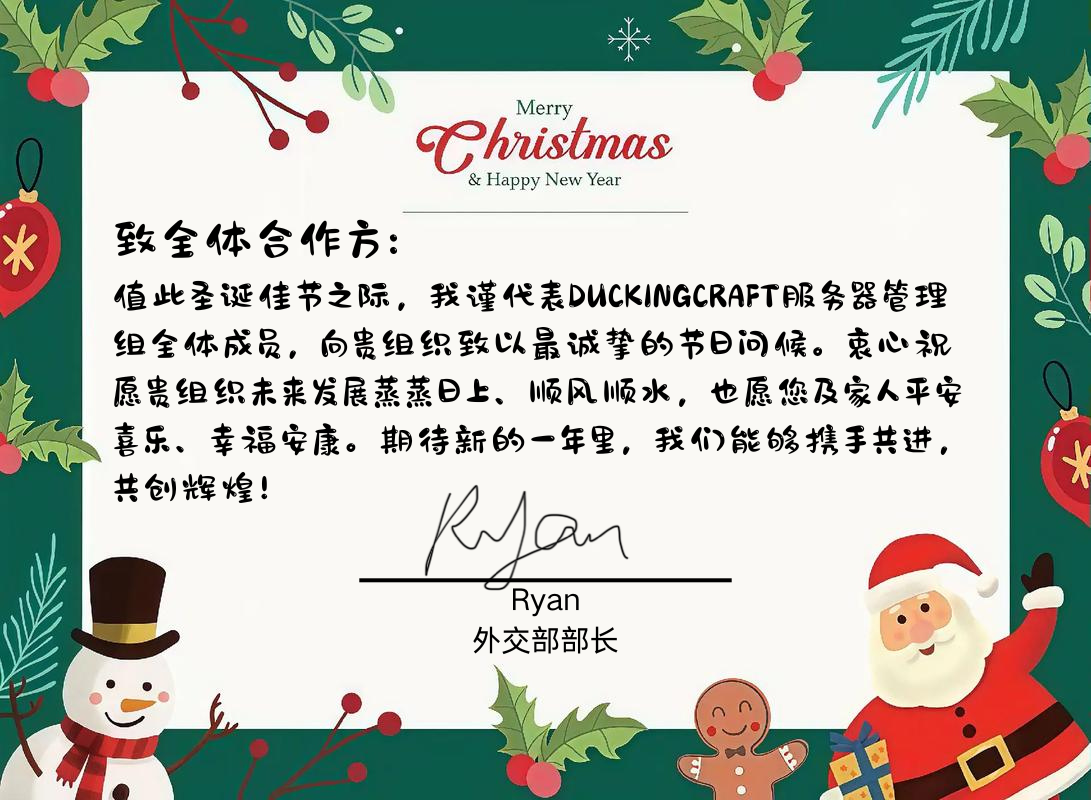 值此圣诞佳节之际,我谨代表DUCKINGCRAFT服务器管理组全体成员,向贵组织致以最诚挚的节日问候。衷心祝愿贵组织未来发展蒸蒸日上、顺风顺水;也愿您及家人平安喜乐、幸福安康。期待新的一年里,我们能够携手共进,共创辉煌!